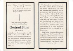 Längeres Leiden; Eltern: Peter Malzkorn u. Agnes geb. Brabender; ∞ 25.6.1931 Hermann Blum, † 18.11.1938; 1 Tochter; lebte als Witwe im elterlichen Haus |