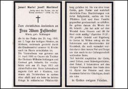 Eltern: Wilhelm Schlangen u. Gertrud geb. Schmitz; ∞ 15.9.1915 Adam Faßbender; 4 K., davon 1 früh †, 1 Sohn im 2. Weltkrieg gefallen; 1 Sohn in Kriegsgefangenschaft; schmerzhafte Krankheit |