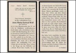 ∞ 28.3.1919 Josef Hubert Wolf; 4 K. (?: 5 überlebende Kinder?); 1 Sohn im 2. Weltkrieg gefallen; das Geschick ihres Sohnes zerrüttete ihre Gesundheit |