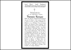 Eltern: Johann Kemper u. Maria geb. Schmitz; bald nach der Schulentlassung wurde sie leidend; |