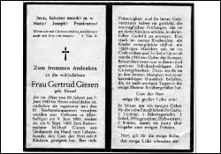 ∞ 9.9.1905 Rottenmeister Michael Giesen aus Ückerath; 6 K., davon 1 früh †, 1 Tochter mit 13 J. †, Sohn Heinrich 1942 im 2. Weltkrieg gefallen; |