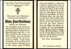 Eltern: Werner Kirschbaum u. Anna Maria geb. Hesch; ∞ 22.1.1895 in Gohr Paul Breitmar, † 26.10.1917, Sohn von Leonhard Breitmar u. Anna Hubertine geb. Müller; 10 K., davon 4 † (1 Sohn im 1. Weltkrieg gefallen); |