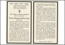 ∞ 27.2.1927 Anton May u. übernahm Mutterstelle für 4 unmündige Kinder; 2 leibliche K.; 2 Söhne im 2. Weltkrieg gefallen; schmerzhafte Krankheit; |