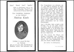 Gefallener 2. Weltkrieg; Eltern: Peter Kluth u. Elisabeth geb. Reibel; 1.10.1940 verließ er die Heimat |