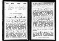 Eltern: ORegR Constanz Schmitz u. Henriette geb. von Schlebrügge; Gymn. Münstereifel; Medizinstudium; 1870/71 Arzt b. Artillerie des Gardekorps; danach praktischer Arzt in Düsseldorf; ∞ 29.9.1874 Maria Lovenfosse aus Münstereifel, † 15.11.1915; 10 K., davon 3 früh †; langes Leiden |
