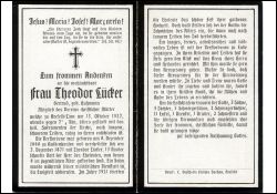 ∞ 3.12.1871 Theodor Lücker; 13 K., davon 4 früh †, 1 Sohn während militär. Dienstzeit † ; 1921 Goldhochzeit; |