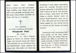 Eltern: Hubert Hagen u. Elisabeth geb. Thelen; ∞ 1926 Wilhelm Paas; 1 Sohn; in den letzten Jahren qualvolle Krankheit |