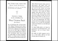 ∞ 31.1.1923 Wilhelm Pesch, Witwer mit 3 unmündigen Kindern, davon 2 † ; ihr Ehemann † 6.12.1942; zuletzt ans Bett gefesselt |