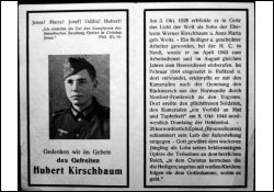 Gefallener 2. Weltkrieg; Eltern: Werner Kirschbaum u. Anna Maria geb. Weitz; Arbeiter bei der H.C. in Neuss; August 1943 Einberufung; Rückmarsch aus der Normandie zu den Vogesen; Grab: Brouwelieures |