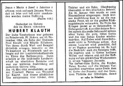 Opfer 2. Weltkrieg; an Typhus in Gefangenschaft †; Eltern: Paul Klauth u. Sibylle Zillekens; erlernte Landwirtschaft; ∞ 15.5.1934 Elisabeth Platen von Tönishof b. Kaarst; 4 K.; 31.1.1944 Einberufung |