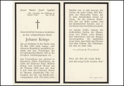 Lange Krankheit, ans Krankenbett gefesselt; Eltern: Peter Hubert Krings u. Gertrud geb. Wieser; ∞ 9.7.1916 Christine Peters; 4 K. |