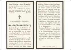 Lange, schwere Krankheit; Eltern: Josef Kronenberg u. Wilhelmine geb. Helmig; ∞ 7.7.1906 Maria Christine Reuter; 10 K., davon 3 kurz nach Geburt †; in den letzten Jahren ans Haus gebunden |
