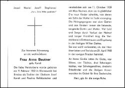 Eltern: Josef Kundt u. Paulina geb. Roßdeutscher; ∞ 11.10.1930 Max Beutner; 9 K., davon 1 †; Verlust der Heimat; lange Krankheit |
