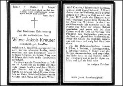 Eltern: Joseph Leuffen u. Anna Sibylla geb. Häuser; ∞ 15.7.1882 Jakob Kreuter aus Gohr, † 2.6.1927, Sohn von Anton Kreuter u. Maria Sibylla geb. Weiser; 7 K.; davon 4 K. † (1 Sohn im 1. Weltkrieg gefallen); |