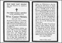 Eltern: Franz Lieser u. Margareta geb. Fritsch; mit 6 J. verlor sie die Mutter; ∞ 25.6.1904 Metzgermeister Gustav Heinen aus Widdeshoven, † vor 11 J.; 1 Sohn; Druck in Anstel |