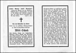 Opfer 2. Weltkrieg; Eltern: Peter Schuh u. Christine geb. Geus; Friseur im elterl. Geschäft; 26.3.1945 russ. Gefangenschaft; tödlicher Sturz von einem Baugerüst; Bruder Johann ebenfalls 1942 in Rußl. gefallenm |