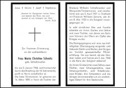 Eltern: Wilhelm Schloßmacher u. Margarete geb. Timmermanns; ∞ 5.4.1921 in Grefrath Friedrich Wilhelm Schmitz, † 8.5.1953; 5 K., davon 1 Sohn im 2. Weltkrieg gefallen |