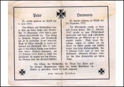 Gefallener 2. Weltkrieg; 2 Tage vor seinem Tod erfuhr er vom Tod seines Bruders Hermann; Beisetzung östl. Obojan; seit 15.11.19138 im Heeresdienst; Einsatz in Holland, Belgien, Frankreich, dann Osten; verlobt |