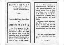 Eltern: Peter Schmitz u. Apollonia Zöller; ∞ 23.7.1899 Franziska Heinen aus Habbelrath; 8 K., davon 6 †; lange, schwere Krankheit; Begräbnis in Habbelrath |