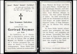 Schlaganfall; ∞ 23.2.1884 Jakob Keymer aus Mödrath; 11 K., davon 2 †; langes Leiden; Druck in Köln-Ehrenfeld |