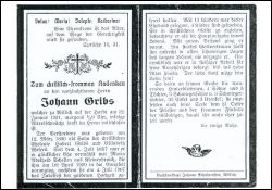 Eltern: Hubert Gribs u. Elisabeth geb. Wefers; ∞ 4.7.1857 Maria Adelheid Schellen aus Kleinenbroich, † 18.4.1909; 1907 Goldhochzeit; 13 K., davon 4 †; |