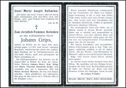 Eltern: Johann Heinrich Hubert Grips u. Maria Theresia Elisabeth geb. Kuller; ∞ 6.9.1900 Maria Gertrud Herions, † 8.2.1910; 3 K.; Druck in Köln-Ehrenfeld |