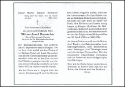 Schlaganfall; Mitgl. St. Matthiasbruderschaft Büttgen-Vorst; ∞ 24.6.1920 in Büttgen-Vorst Josef Hamacher aus Kaars, † bei Bombenangriff 1.8.1942t; 5 K., davon 1 früh †, Sohn Willi im 2. Weltkrieg in Italien vermisst; Wohnort: Büttgen |