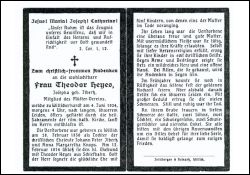 Langes, schweres Leiden; Eltern: Johann Peter Ilbertz u. Anna Margaretha geb. Knops; ∞ 12.2.1874 Theodor Heyes aus Schiefbahn; 5 K., davon 1 †; Goldhochzeit 1924 |