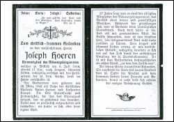 Ehrenmitglied Männergesangverein; langes Leiden; Eltern: Anton Hoeren u. Katharina geb. Kamps; 57 J. Mitglied MGV; |