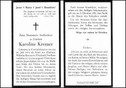Fräulein; Eltern: Wilhelm Kremer u. Elisabeth Nuellens; Hilfe u. Stütze der Eltern bis zu deren Tod; teilte mit ihren beiden Schwestern den Haushalt |