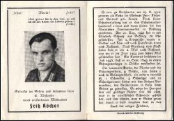 Gefallener 2. Weltkrieg; Eltern: Peter Köcher u. Gertrud geb. Lieven; Schuhmacherhandwerk; arbeitete später in Rhein. Linoleumwerken in bedburg; ∞ 20.8.1942 Elisabeth Schmitz aus Bedburg; seit 140 Soldat: zuerst in Frankreich, dann Russland; nach Genesung vom Fleckfieber zum 2. Mal nach Russland; Todesnachricht erst im Juli 1948; 1 Bruder noch in Kriegsgefangenschaft |