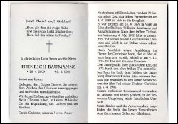 Eltern: Wilhelm Baumanns u. Anna geb. Schmitter; früher Tod des Vaters; Geschwister: Christine, Jakob; im Dienst der Gemeinde Vorst; ∞ 4.11.1925 Johanna Kämmer, † 1972; 9 K., davon Tochter Christine † 5.4.1945 |