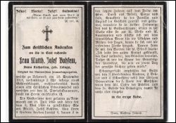 Mitgl. Marian. Frauenkongregation; ∞ 3.5.1890 Matthias Josef Bohsem; 9 K., davon 6 † (davon 2 im 1. Weltkrieg gefallen); Druck in Zülpich |