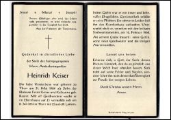Eltern: Franz Keiser u. Katharina geb. Reuter; ∞ 8.7.1931 in Thorr Elisabeth Lamers; Druck in Kerpen |
