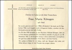 Langes Leiden; ∞ 25.5.1925 Dentist Michael Könsgen, † 28.12.1961; 2 Söhne; Druck in Birkesdorf |