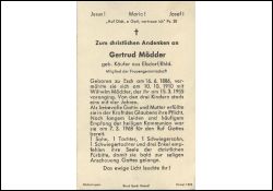Wohnort: Elsdorf, Rhld.; Mitgl. Frauengemeinschaft; ∞ 10.10.1910 Wilhelm Mödder, † 15.3.1955; 3 K., davon 1 mit 4 J. †; langes Leiden; Druck in Elsdorf |
