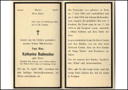 Mitgl. Frauen- u. Mütterverein der Pfarre Herz-Jesu in Duisburg-Serm; ∞ 1.6.1908 Johann Radmacher, † 17.7.1960; 12 K.; 4 Söhne im 2. Weltkrieg gefallen |