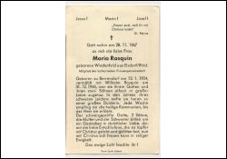 Mitgl. kath. Frauengemeinschaft; ∞ 31.12.1946 Wilhelm Rasquin; 2 Söhne; schweres Leiden; Druck in Elsdorf |