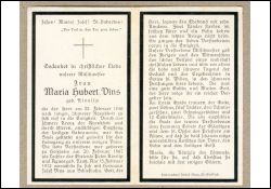 Lange, schwere Ktrankheit; Eltern: Peter Kivelip u. Agnes geb. Kratz; ∞ 13.2.1912 Hermann Josef Vins aus Schiefbahn; 10 K., davon 2 früh †, 1 Sohn im 2. Weltkrieg gefallen; Druck in Mönchengladbach |