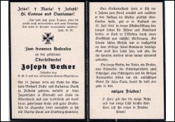 Gefallener 2. Weltkrieg; Eltern: Gerhard Becker u. Katharina geb. Beuth; ∞ 29.12.1940 Martha Pauw aus Duisburg-Hamborn; seit 6. J. Berufssoldat; Einsatz im Westen, dann Russland |