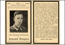 Gefallener 2. Weltkrieg; Eltern: Gerhard Bingen u. Gertrud geb. Neuen; seit 1938 bei der Fahne; Feldzüge in Polen, Frankreich, Russland; am 15.8.1941 verwundet; danach erneut eingesetzt; ∞ 22.12.1940 Magdalena Schlangen aus Pulheim |