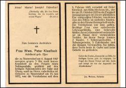 Schlaganfall; ∞ 5.2.1895 Peter Kleefisch aus Köln-Merheim linksrhein., ∞ 25.10.1933; 3 K., davon 1 früh †; |