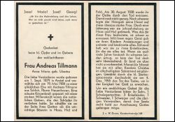 ∞ 19.5.1904 Andreas Tillmann aus Schlich, Pfarre Neuenhoven; umsichtige Bäuerin; Gatte † 30.8.1938; durch jahrzehntelange Lähmung an das Haus gefesselt1 überlebender Sohn (Hubert) |