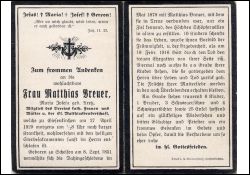 Mitgl. Verein kath. Frauen u. Mütter, St. Matthias-Bruderschaft; ∞ Mai 1878 Matthias Breuer, † 19.2.1916; 10 K., davon 4 † |