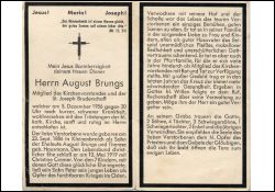 Mitgl. Kirchenvorstand u. St. Joseph-Bruderschaft; Eltern: August Brungs u. Therese geb. Hausmann; ∞ 13.5.1919 Christine Cremer; 7 K., davon Sohn Peter im 2. Weltkrieg im Osten gefallen; Landwirt |