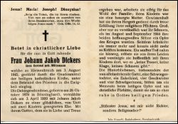 ∞ 3.4.1910 Johann Jakob Dickers; 2 Söhne, beide im August u. September 1944 gefallen; seitdem kränkelnd |