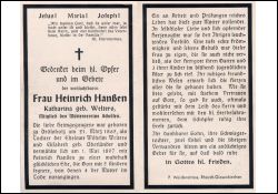Mitgl. Mütterverein; Eltern: Wilhelm Welters u. Elisabeth geb. Oberländer; ∞ 1.5.1897 Heinrich Hanßen; 5 K., davon 4 †; Druck in Rheydt-Giesenkirchen |