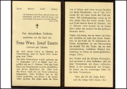 ∞ 17.2.1898 Josef Essers aus Neuenhoven, † 27.1.1953; 10 K., davon 3 früh †; 1 Sohn † mit 41 J., 1 weiter Sohn † wenige Stunden vor ihrem eigenen Hinscheiden; 1948 Goldhochzeit |