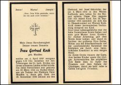 Schweres Leiden; Eltern: Peter Maaßen u. Anna geb. Esch; ∞ 29.11.1940 Josef Schnitzler, im 2. Weltkrieg am 6.3.1943 in Russland gefallen; 1 K.; ∞ 28.9.1946 Werner Koch; 1 K. |
