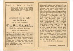 Mitgl. Mütterverein; Eltern: Hubert Meurers u. Anna Christina geb. Hermanns; ∞ 7.2.1902 Peter Hubert Nilgen; 5 K. |